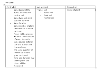 Today I received my marks for my SRP plan. I got a 3/4 and am required to adjust my materials and aim in order to have a perfect SRP. I made the mistake of placing my protective equipment in the materials section, leading to a loss of marks as these are supposed to only be addressed in the risk assessment. I have also been faced with a problem regarding my pH test. I was originally going to use baking soda and vinegar to test for acidity, however, this only indicates whether something is acidic, basic or alkaline, rather than providing an accurate pH. I have decided to resolve this by using the electronic pH indicator that is in class. This requires me to have my soil prepared before the allocated lesson that I have for conducting my experiment.